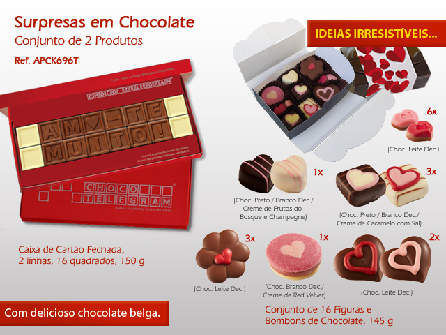 Ref. APCK696T - ChocoTelegram AMO-TE MUITO + Caixa Sweet Média com 16 Fig. e Bombons Chocolate, 155 g