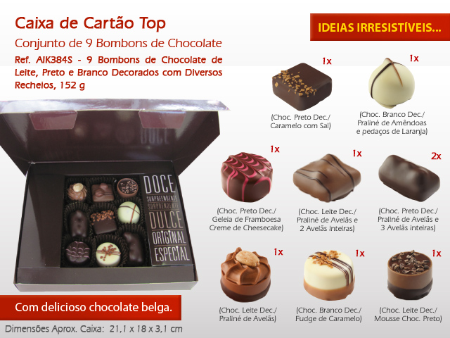Ref. AIK384S - Conj. 9 Bombons de Chocolate Leite, Branco e Preto Decorados com Diversos Recheios, 150 g