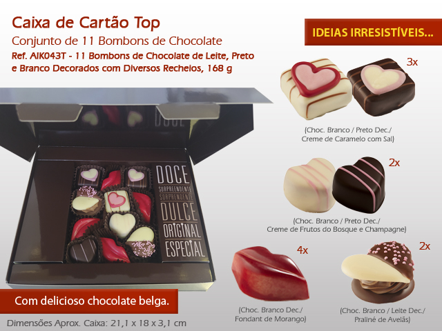 Ref.AIK043T - Conj. de 11 Bombons Choc. Leite, preto e branco decorados e recheados, 168g