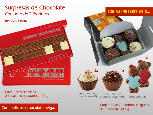CHOCOLATE DE LEITE. Ingredientes: açúcar, manteiga de cacau, LEITE gordo em pó, pasta de cacau, emulsionante (lecitina de SOJA), aroma natural de baunilha. Cacau: 32% mínimo. CHOCOLATE BRANCO. Ingredientes: açúcar, manteiga de cacau, LEITE gordo em pó, emulsionante (lecitina de SOJA), aroma natural de baunilha. Cacau: 28% mínimo. PODE CONTER FRUTOS DE CASCA RIJA, GLÚTEN E OVO.