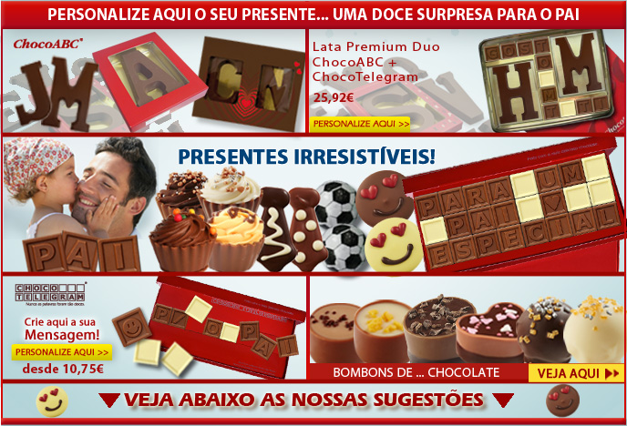Aqui conseguirá encontrar aquele presente especial e único, personalizável por si, para um Pai Especial! De forma fácil, rápida, mas sobretudo doce e original, para que lhe possa dizer tudo o que lhe vai na alma, mas em chocolate...