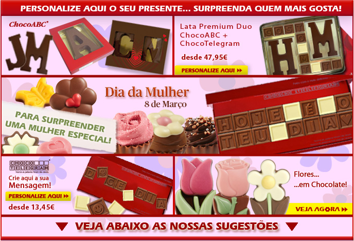 Aqui conseguirá encontrar aquele presente especial e único, personalizável por si, para uma Mulher Especial! De forma fácil, rápida, mas sobretudo doce e original, para que lhe possa dizer tudo o que lhe vai na alma, mas em chocolate...