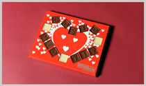 Para dar ainda mais vida ao seu ChocoTelegram, desenvolvemos uma nova embalagem... Consiste numa base onde assentam 14 deliciosos quadradinhos de chocolate dispostos sob a forma de um coração e com uma tampa de acetato. A particularidade é que a embalagem é ainda envolvida com uma manga vermelha cheia de corações (ver imagem abaixo) mas recortada para que se possa ver a mensagem em chocolate.